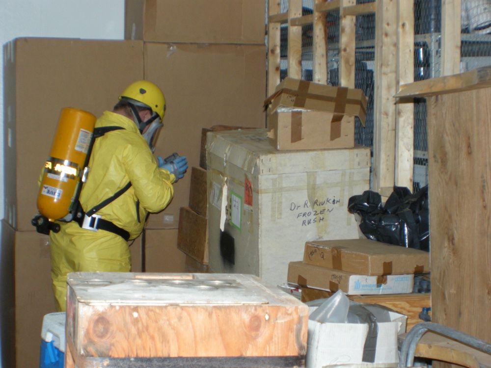 A team of hazmat specialists atmospheric sampling with on-site analytical equipment to determine the location and concentrations of the substance throughout the facility. This process was hampered by extensive amounts of research equipment and materials stacked floor to ceiling, most with no markings. As a result, every item in the facility had to be individually identified, inspected and segregated. Contaminated and leaking materials were repackaged and inventoried for disposal. In the course of this piece of work, the team discovered a mercury spill and radioactive contamination. Both of these discoveries significantly altered the project scope and on-site protocols, however, project timelines were maintained.